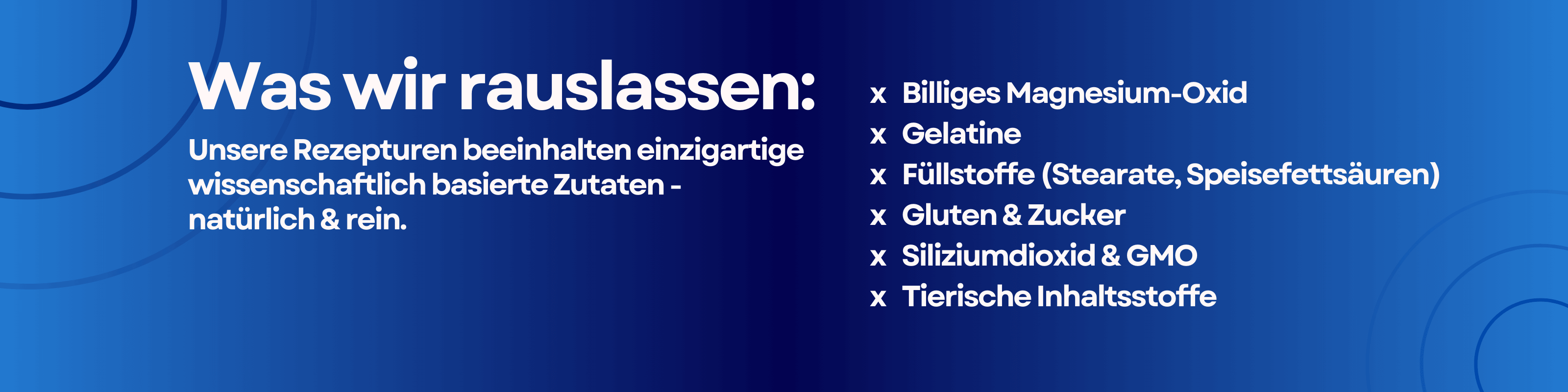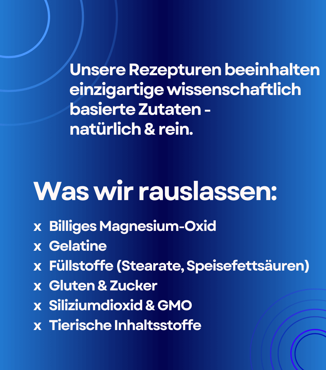 Unsere Supplements enthalten nur die Inhaltsstoffe, die wirklich zählen – ohne versteckte Zusätze oder unnötige Füllstoffe (Farbstoffe, Stearate, Titandioxid, Süßstoffe, wie Aspartam) etc.