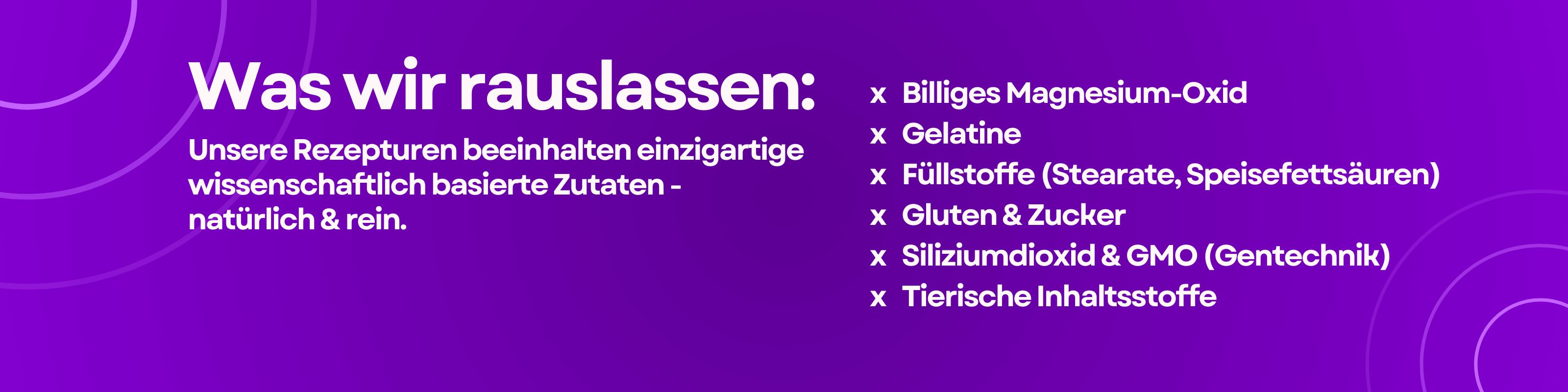 Unsere Supplements enthalten nur die Inhaltsstoffe, die wirklich zählen – ohne versteckte Zusätze oder unnötige Füllstoffe (Farb-& Trennstoffe, Stearate, Titandioxid, Süßstoffe, wie Aspartam) etc.