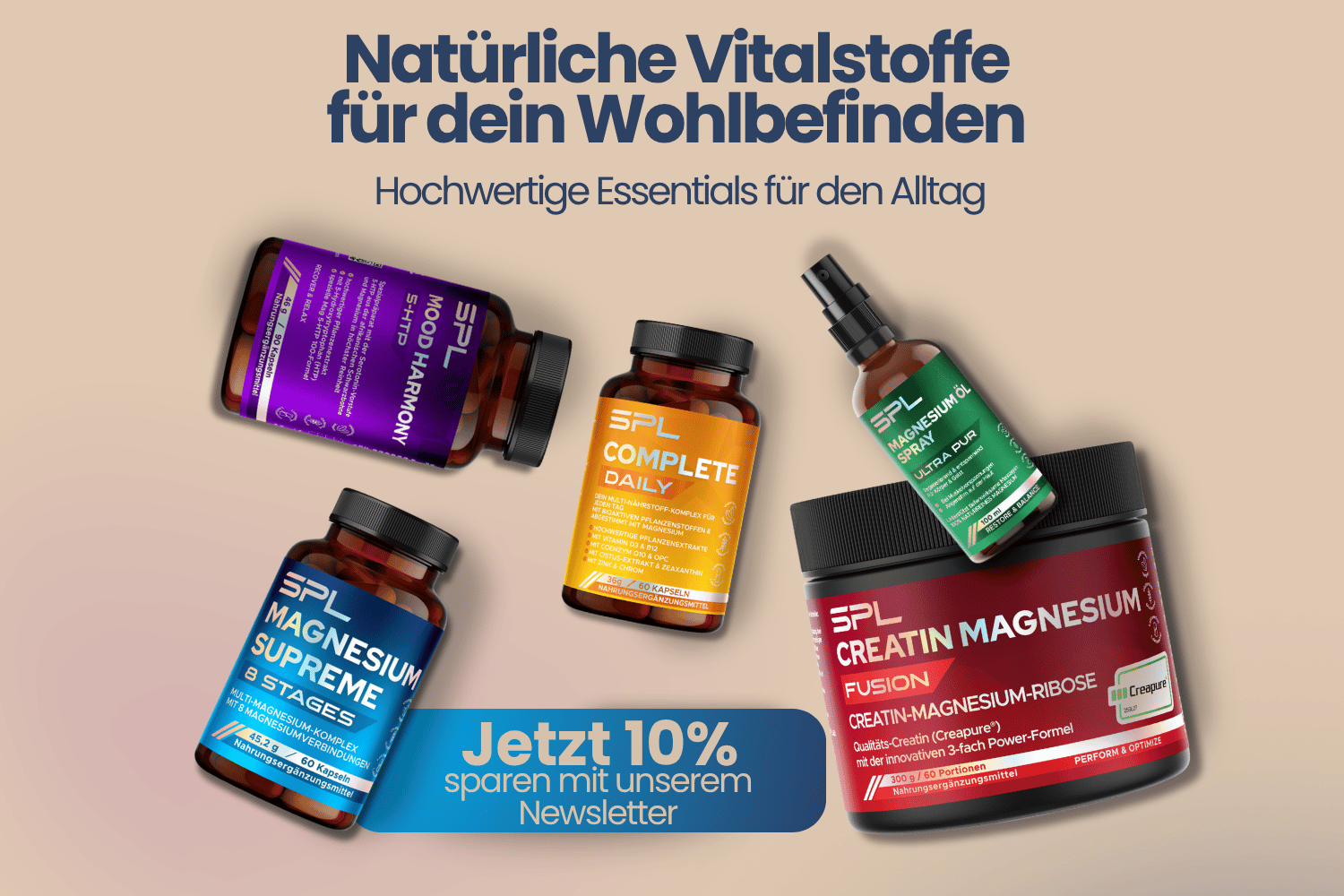 Das SPL Starter Set Vital vereint vier unserer beliebtesten Produkte für einen optimalen Start in deinen gesunden Alltag. Ob du deine mentale Balance unterstützen, deine Muskelfunktion optimieren oder dein Immunsystem mit hochwertigen Mikronährstoffen versorgen willst – dieses Bundle ist deine clevere Komplettlösung.
